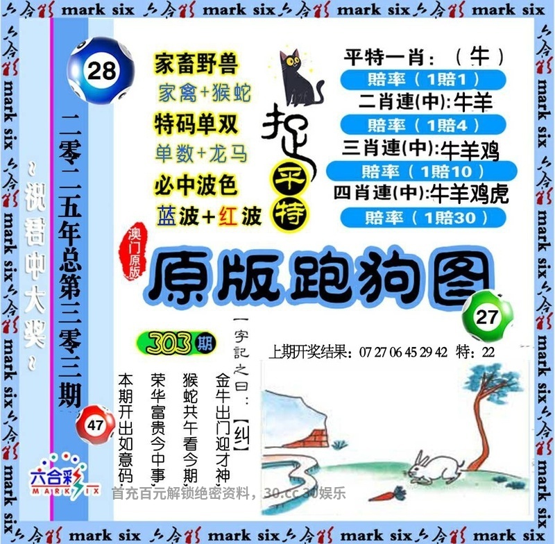 | 303期五肖 | 蛇猴牛龙兔 | 开:兔15 |